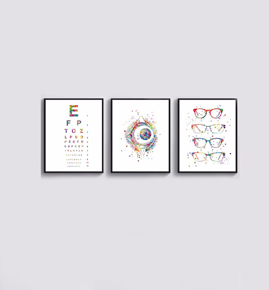 Graphismes des yeux, illustrations optiques, schémas colorés : ces œuvres décoratives améliorent le confort visuel du cabinet et renforcent l’identité du spécialiste. Parfait pour créer un espace clair, sérieux et accueillant.