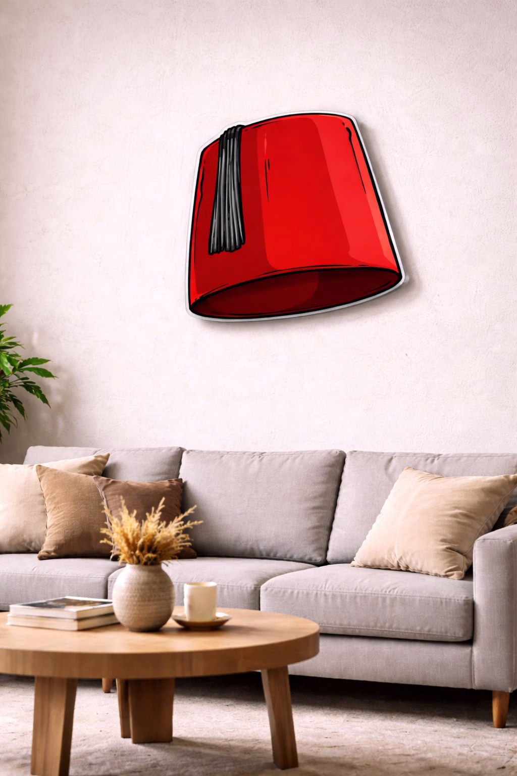 Cette décoration murale de tarbouch marocain rouge représente l’élégance et l’authenticité de la culture marocaine. Un art décoratif idéal pour sublimer un salon, un bureau, un café ou un espace professionnel au Maroc.