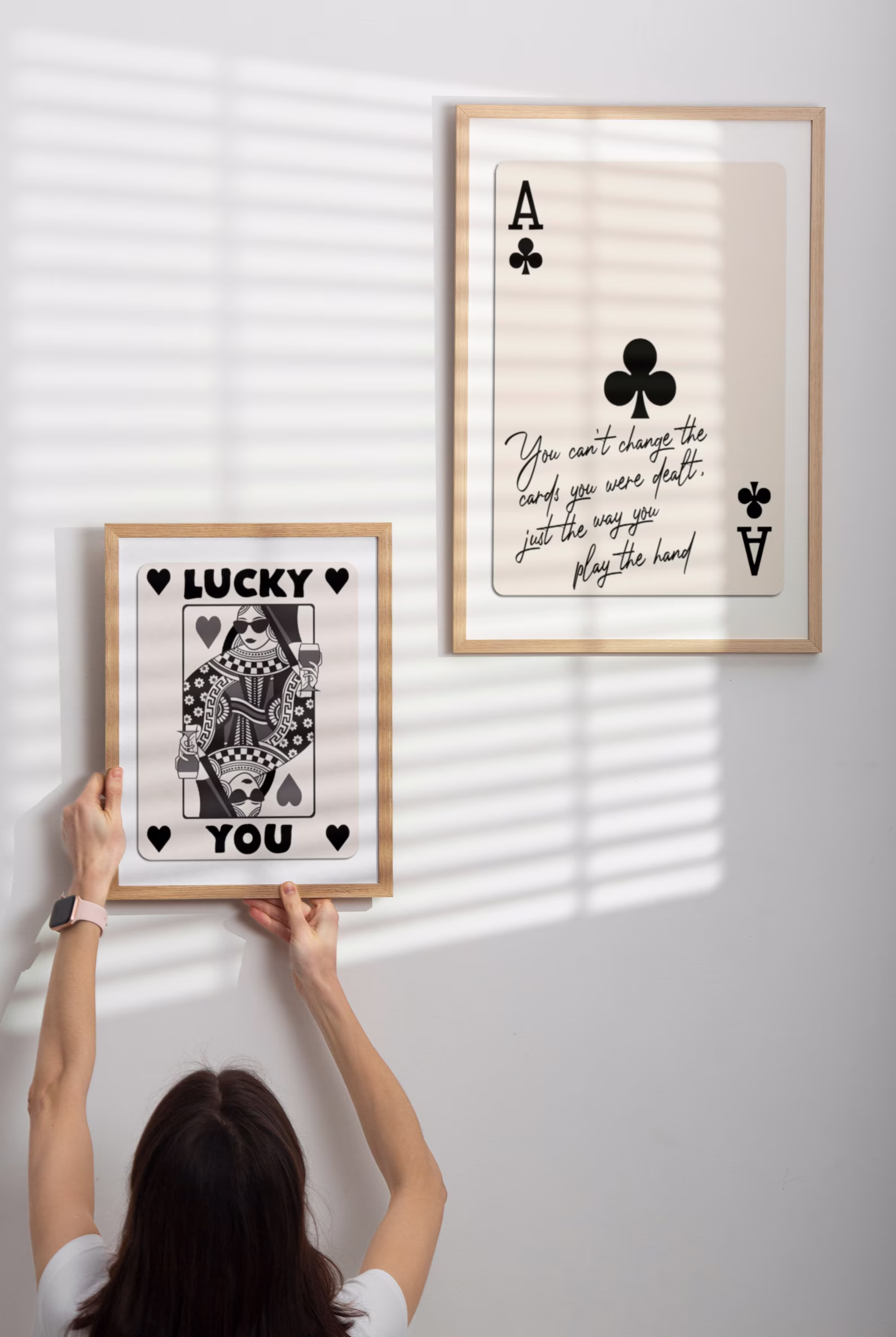Ajoutez une touche de style et d’audace à votre intérieur avec ces tableaux décoratifs inspirés des cartes à jouer. Cet ensemble “Lucky You” et “Ace” marie élégance rétro et design maximaliste moderne. Parfait pour un salon, une chambre ou un coin bar, il reflète une esthétique preppy chic et pleine de caractère.