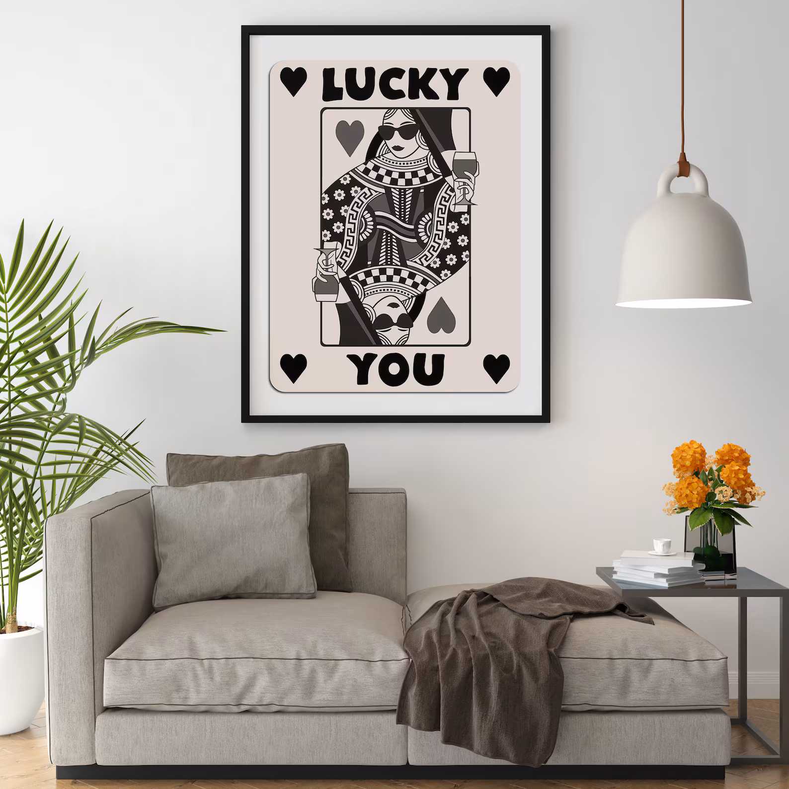 Ces affiches d’art mural au style carte à jouer combinent humour, chance et design minimaliste. L’As noir et la Reine “Lucky You” créent une décoration unique qui attire le regard. Idéal pour ceux qui aiment les décors originaux et les ambiances artistiques et tendance.
