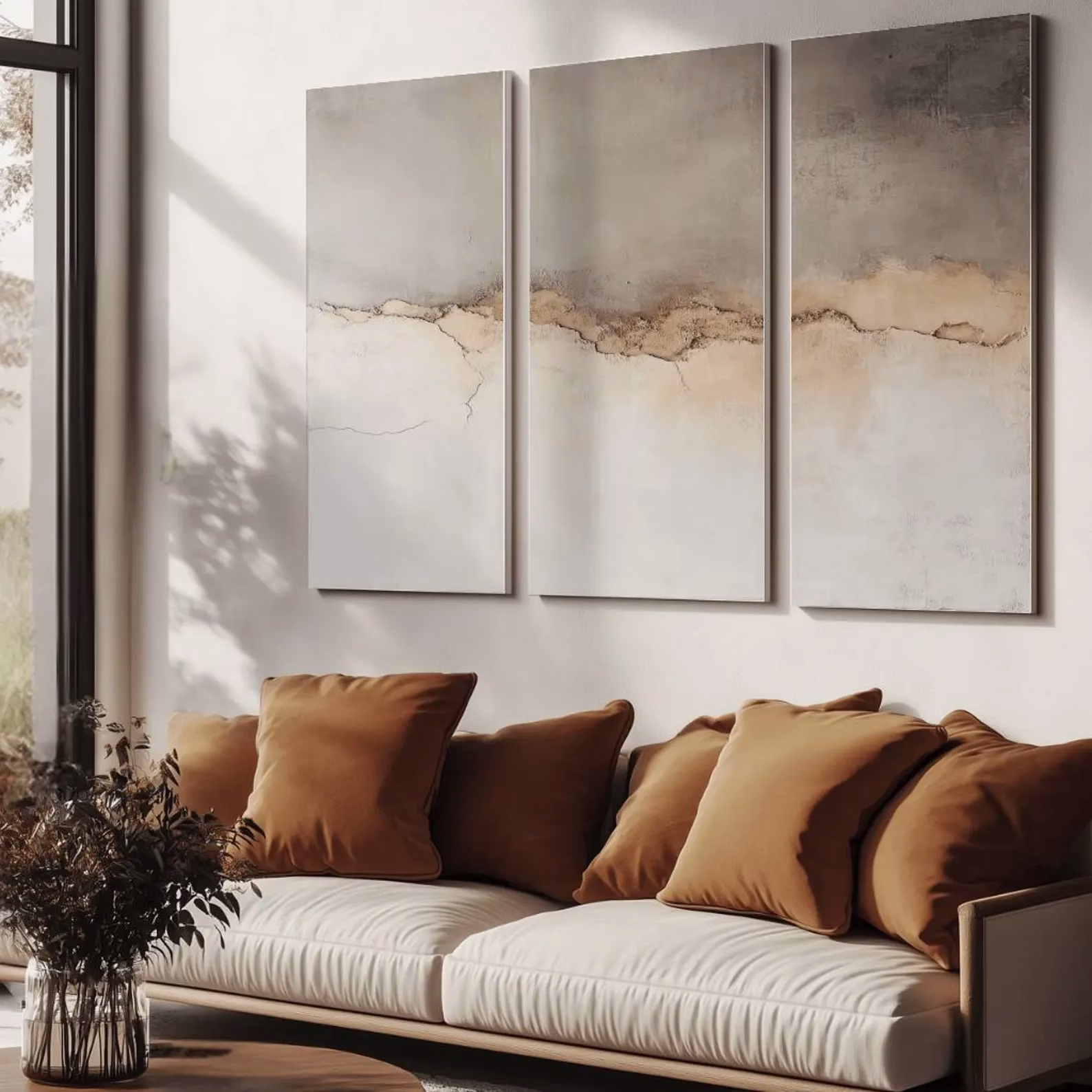 Oeuvres d’art Japandi pour chambre – Triptyque au-dessus du lit